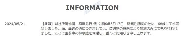 根據梅津秀行所屬的經紀公司「81 Produce」的消息,他因間質性肺炎於5月17日去世。尊重家屬的意願,他的喪禮在家人的陪伴下進行,並對他的生前所有相關人士表示感謝。