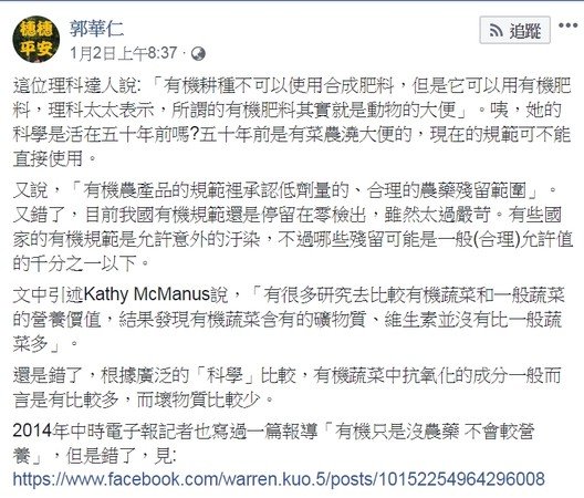 看似充滿教育性的影片,卻引起農糧署的臉書粉專「鮮享農YA」罕見發文澄清,直說「錯誤消息請勿相信」,希望透過貼文避免民眾被誤導。就連臺灣大學農藝學研究所郭華仁教授也特地發文,「 咦,她的科學是活在五十年前?五十年前是有菜農澆大便的,現在的規范可不能直接使用。」