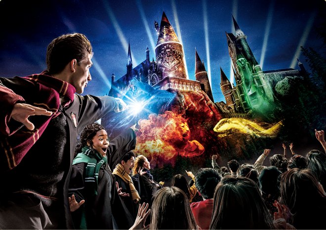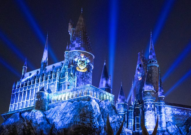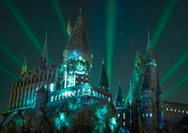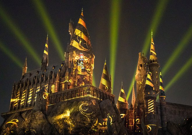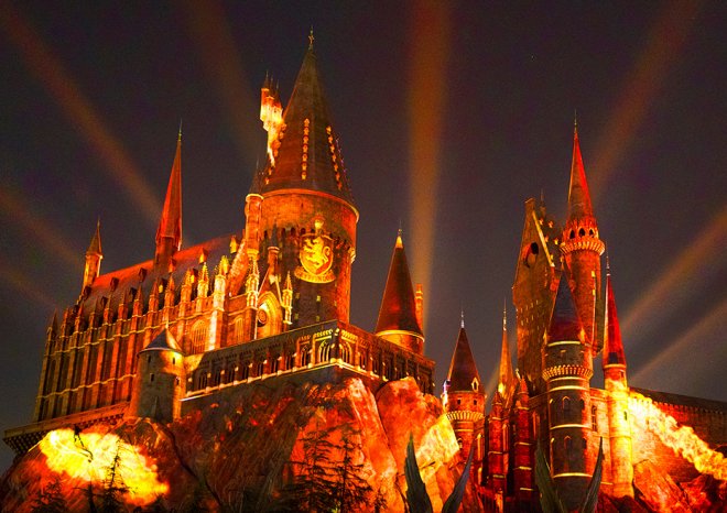 這超美的魔幻光雕,與現實中的演員、城堡互相交織、碰撞,美麗的光束與亮光照亮了整個天空,就像真的身處霍格華茲一樣,波特迷怎麼能錯過呢?
