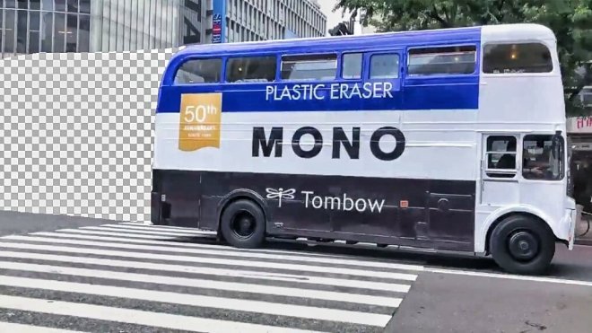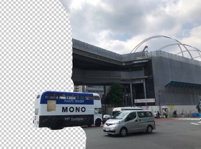 ▼有網友則幽默地修圖,把橡皮擦巴士經過的地方修成白灰相間的「透明圖層」,就好像橡皮擦車真的把街景給擦掉了一樣,非常有趣。