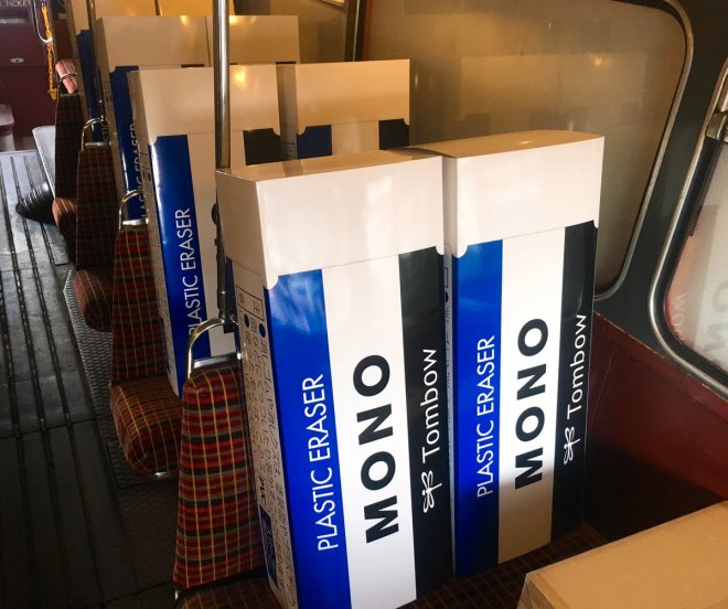 走在東京街頭,怎麼看到這個超懷舊的文具!日本蜻蜓牌(Tombow)「MONO橡皮擦」,今年(2019)已滿50週年,藍、白、黑三色的經典造型陪伴許多人走過求學時期。在50週年這個特別的日子,蜻蜓牌也特別打造了一台「橡皮擦巴士」給民眾免費搭乘,就在東京地區行駛!