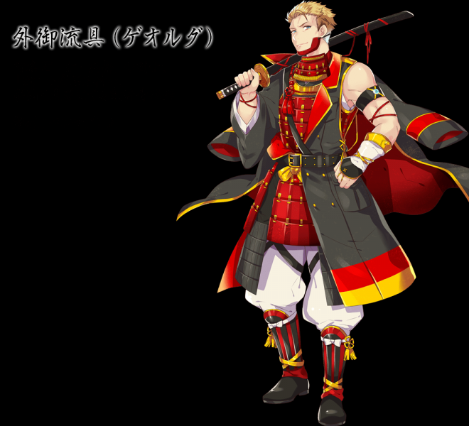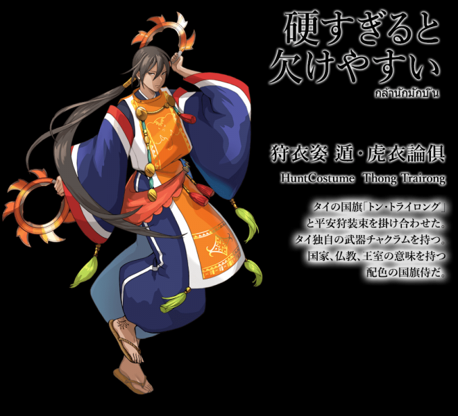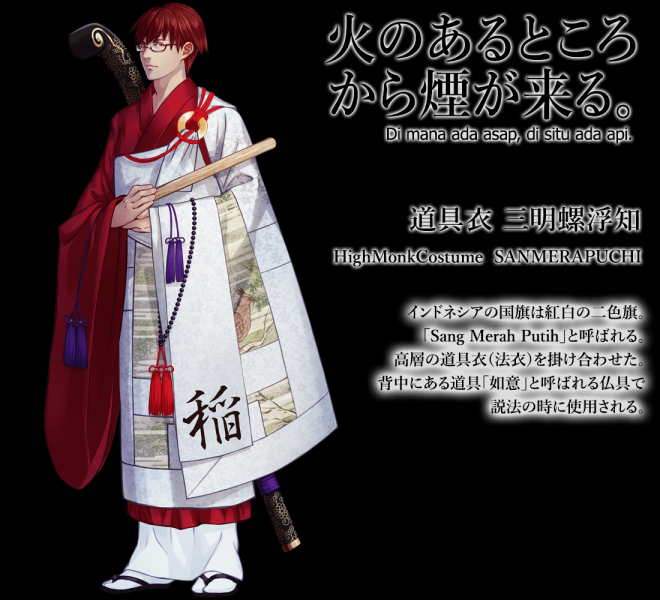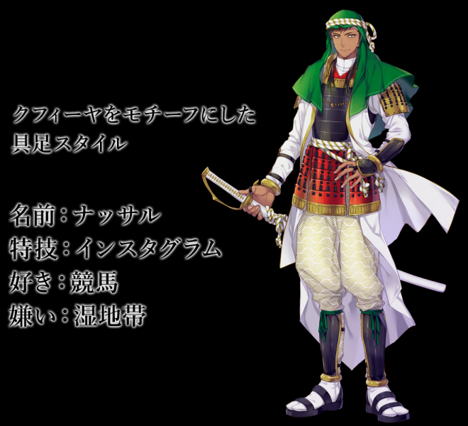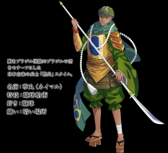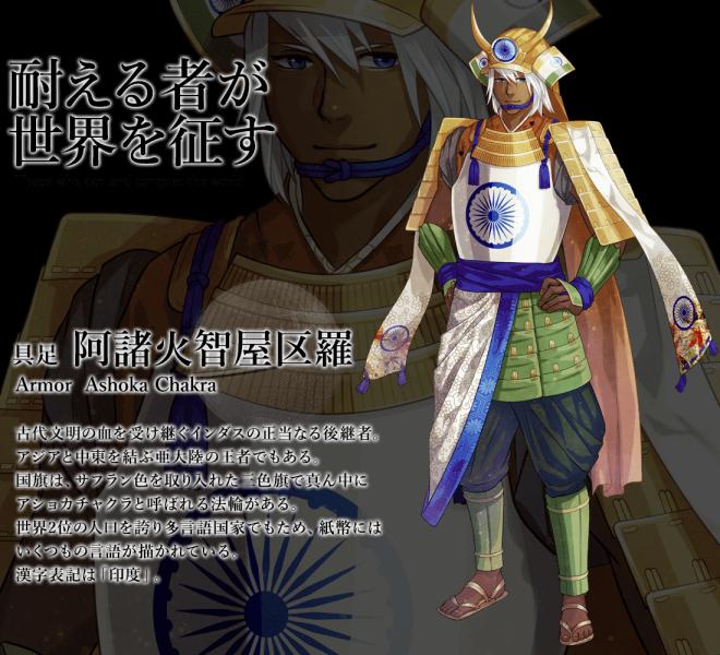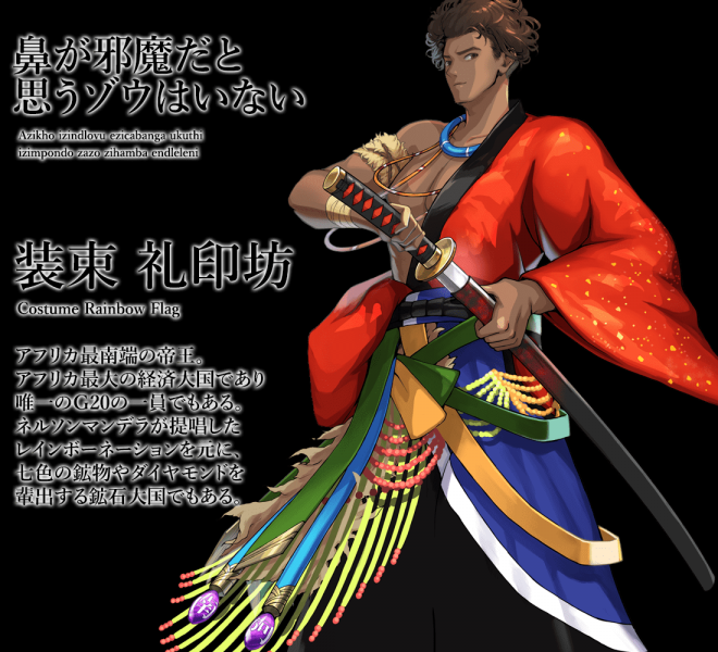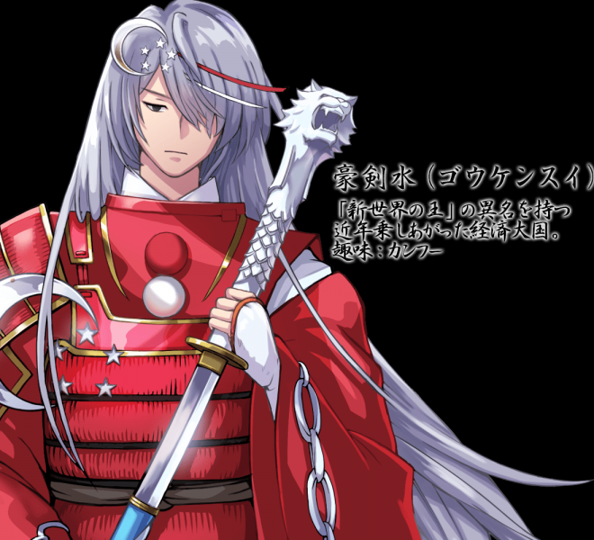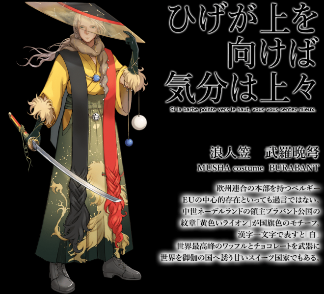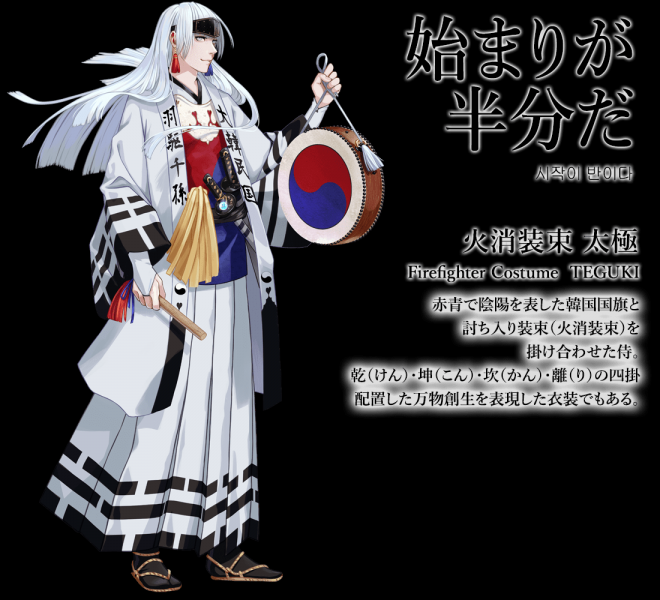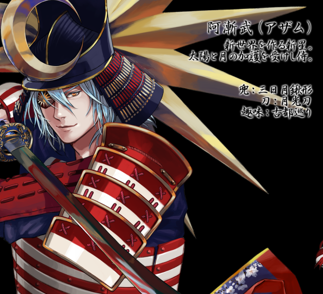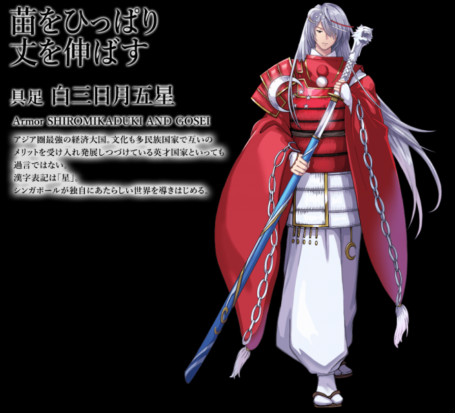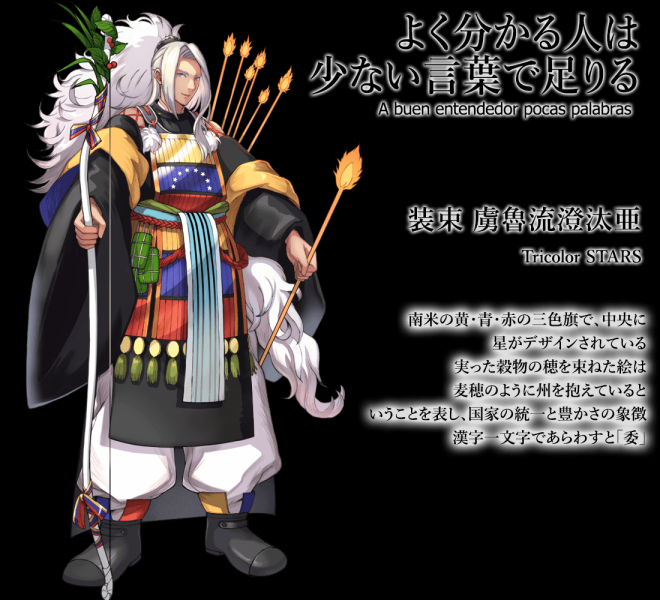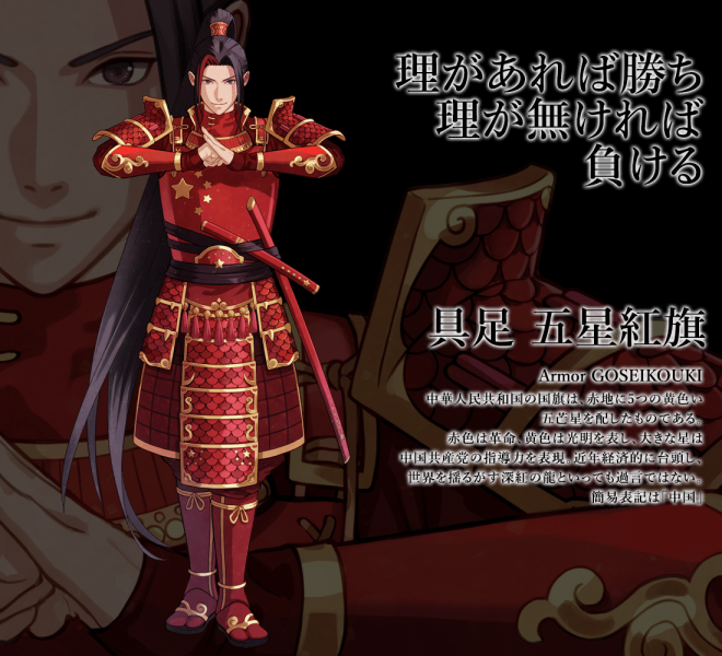 ▼先來看日本國旗:名為「釜本」,身穿白色和服、手持日輪傘、腰懸長短太刀,整體的形象就是一個超帥氣的日本武士!