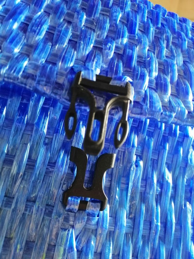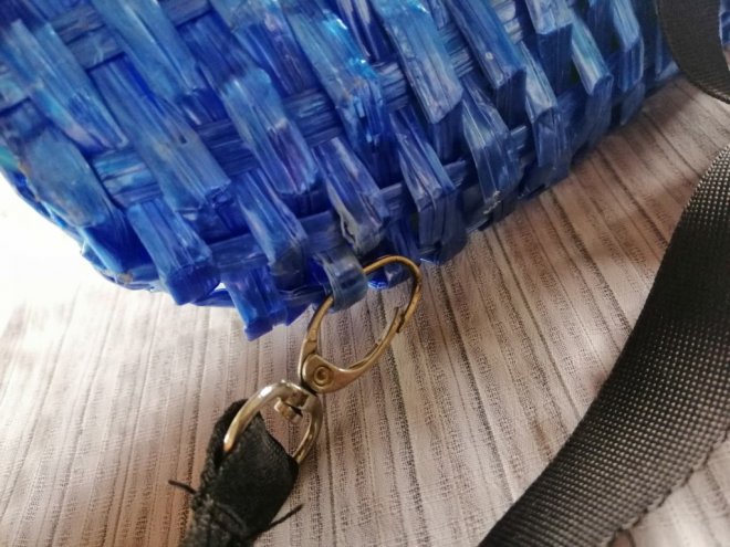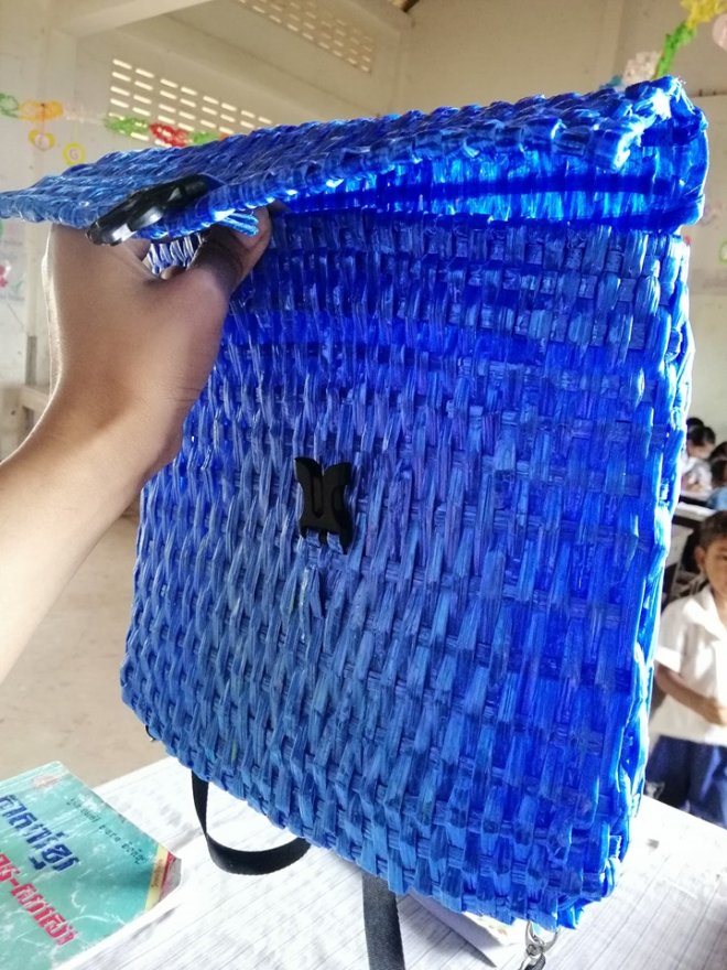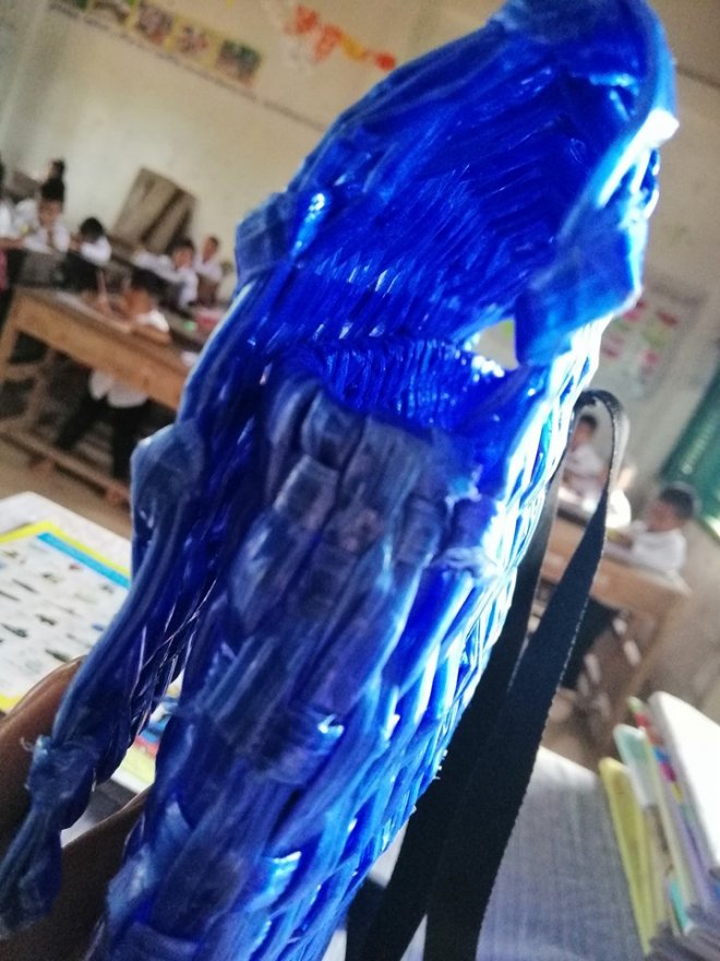 ▼但男童的爸爸也發揮巧思,利用家裡的藍色尼龍繩,親手為孩子編織了一個堅固、耐用又美觀的書包!