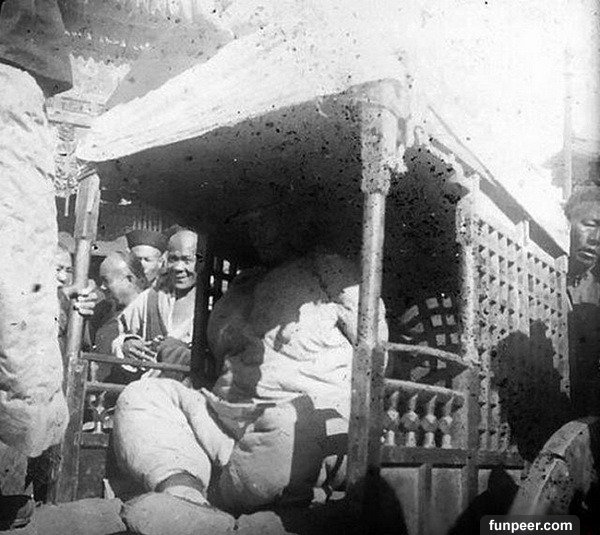 刑場南端的門現在關上了,一個衛兵站在門內,隨後罪犯們很快帶到。大部分步行,但有些是蜷縮在大筐里,每個大筐由兩人抬著。罪犯們無一絲生氣,可能是過於害怕,或是囚禁、審訊期間受到了毒打所致。
