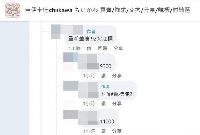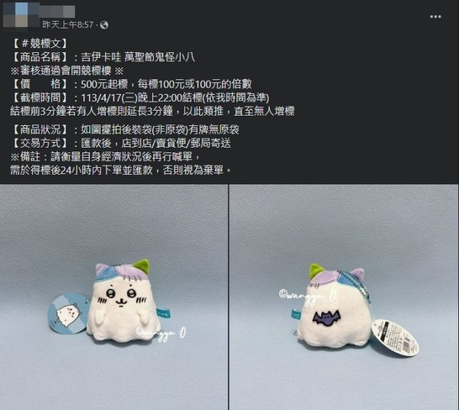16日上午近9點,一位網友在FB社團「吉伊卡哇chiikawa ちいかわ 買賣/徵求/交換/分享/競標/討論區」發文,希望競標一個名為「吉伊卡哇 萬聖節鬼怪小八」的娃娃吊飾,起標價為500元,每次加價100元或100元的倍數,競標截止時間設定在當晚10點。