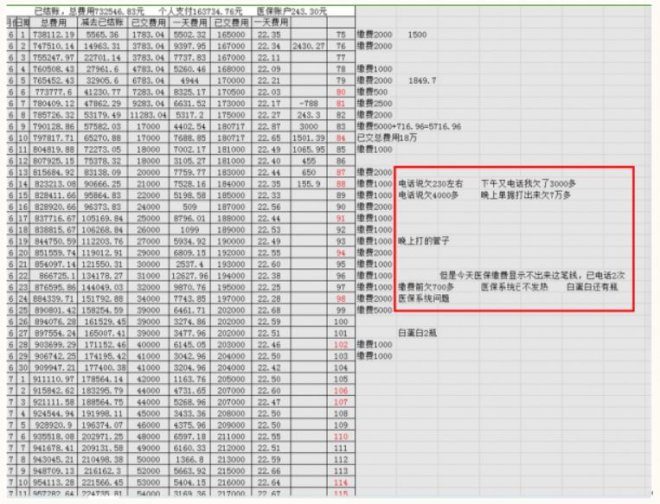 楊姓博士表示,因為姑媽是名老會計,每次交完費用,都會讓ICU護士開立單據,看看費用結餘,還做了張Excel表格,推算每天需自費的大致項目。而自2022年6月起,ICU護士就常常打給姑媽說:「賬上錢不夠,要交錢,否則影響治療。」